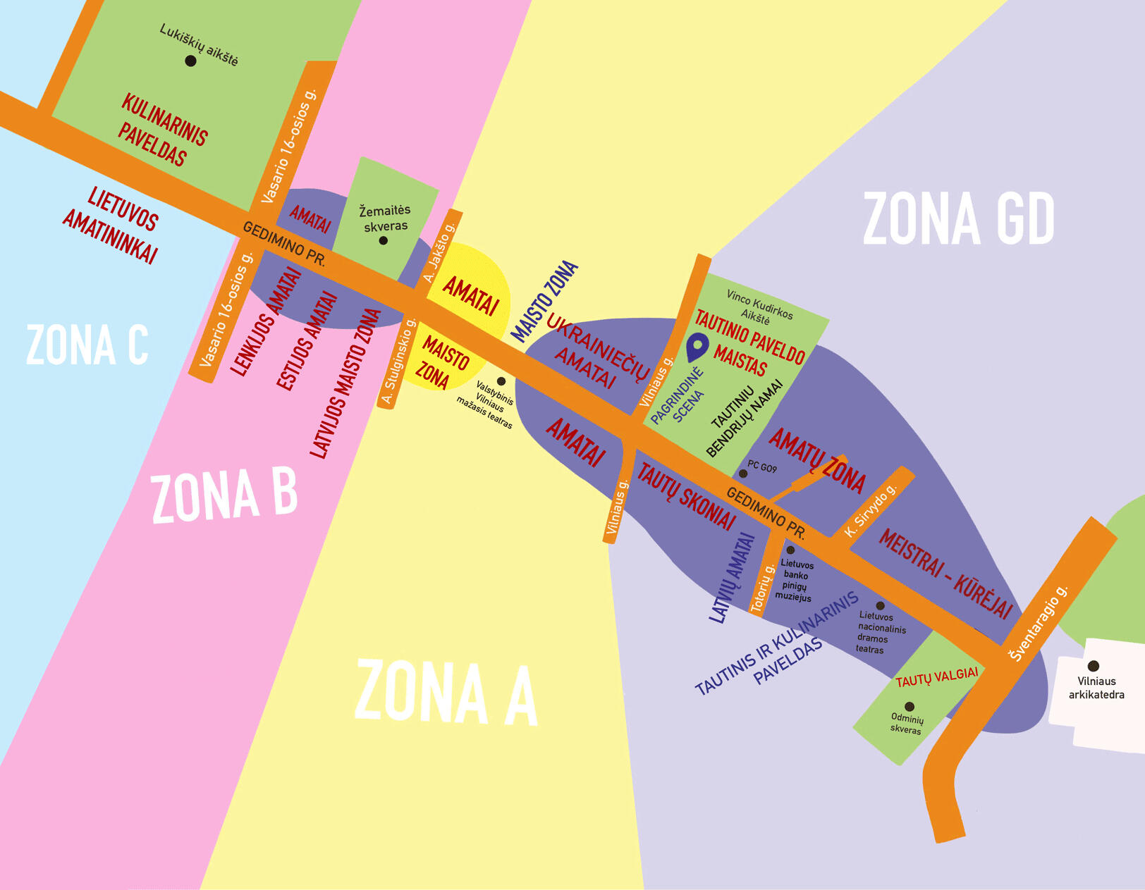 * C zona: Gedimino prospektas nuo Vasario 16-osios g. iki J. Tumo-Vaižganto g.Kiekvienoje zonoje bus įkurdinti įvairūs amatininkai, pagal jų pateikiamą prekių asortimentą.