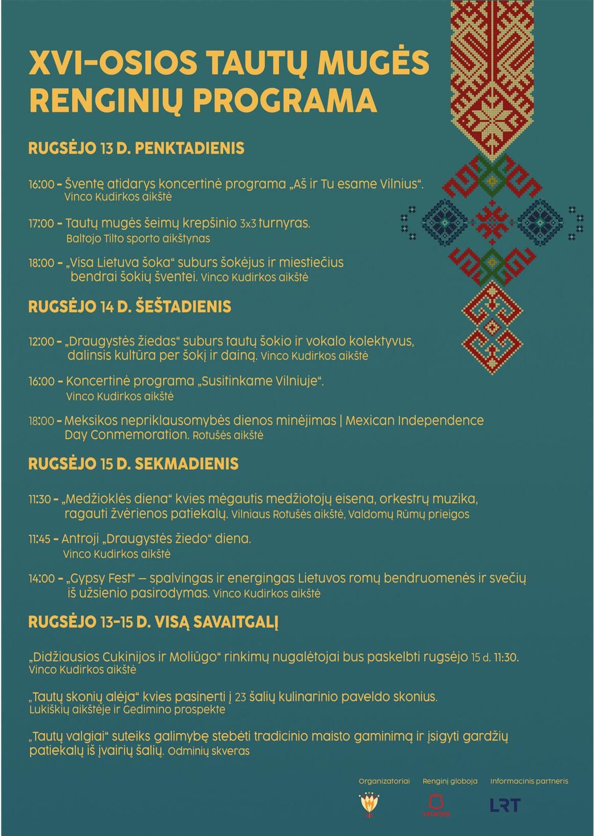 12 00 val. Festivalis "Draugystės žiedas". Dalyvauja Lenkų dainų ir šokių meno ansamblis "Wilia", Tautinių šokių ansamblis "Vilniaus Pynimėlis", Vilniaus universiteto liaudiškos muzikos ansamblis "Jaunimėlis”, Liaudies šokių kolektyvas "Hałas", Šokių kolektyvas "Kropelki", Vokalinis ansamblis "Korzyść", Totorių kultūros centro folkloro ansamblis "Ilsu", Dainų ir šokių ansamblis "Rudomianka"